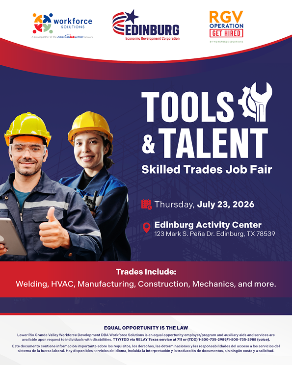 On Thursday, July 23, 2026, the Edinburg Activity Center will host the Tools & Talent Skilled Trades Job Fair. This premier hiring event is dedicated to connecting skilled tradespeople in welding, HVAC, manufacturing, construction, mechanics, and more with employers who value hands-on expertise.
